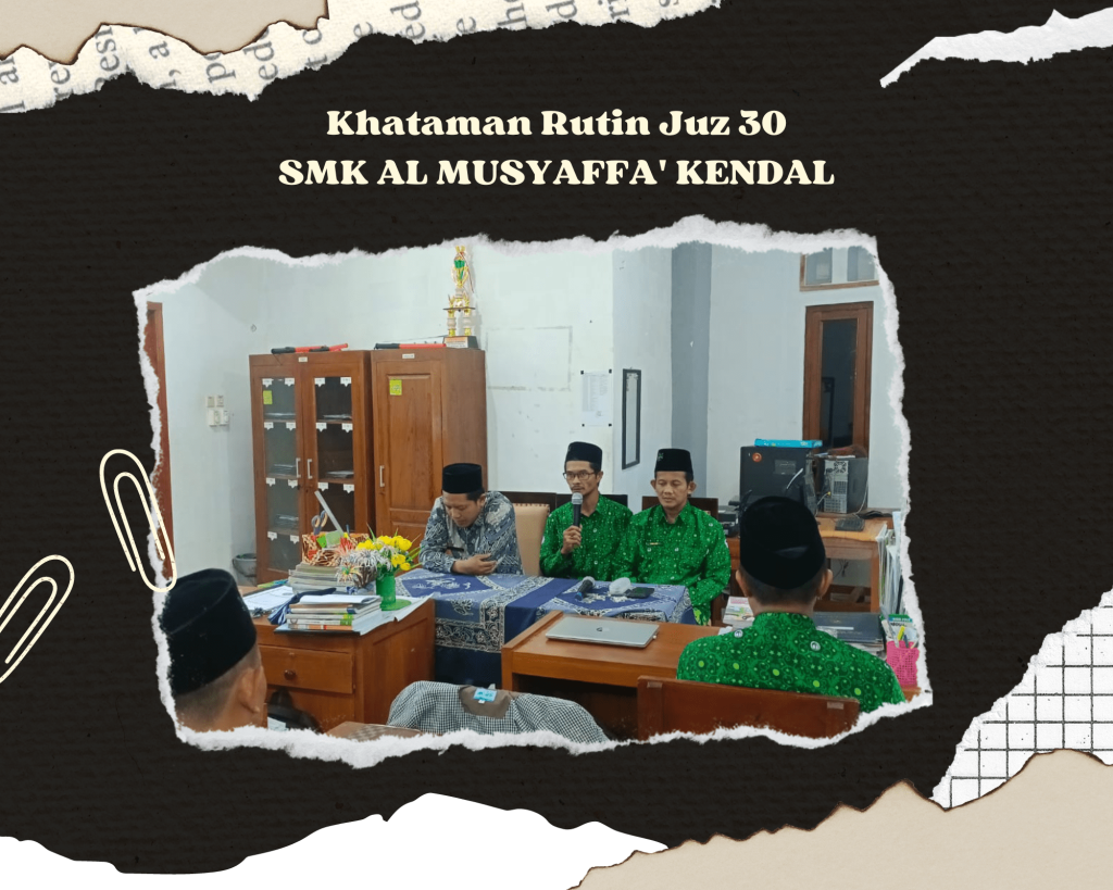 Alhamdulillah kami di SMK Al Musyaffa’ Kendal mempunyai kegiatan rutinan di setiap tanggal 20 pada setiap bulannya yaitu Kegiatan Rutinan Khataman Al Qur’an 30 Juz yang diikuti oleh segenap Guru & Karyawan. Yang mana dengan di adakan kegiatan ini mempererat silaturrahmi & kerukunan antar sesama yang mana mestinya sangat besar manfaatnya.