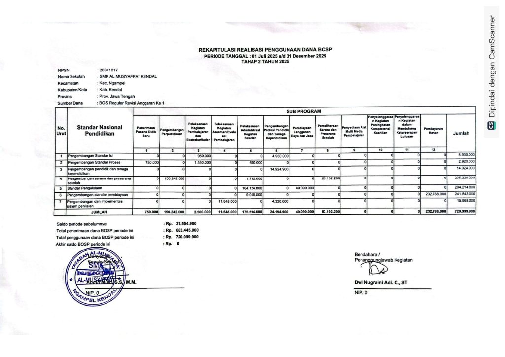 Beranda » Berita » Rekapitulasi Penggunaan Dana BOSP Tahap 2 Tahun 2025 SMK Al Musyaffa’ KendalRekapitulasi Penggunaan Dana BOSP Tahap 2 Tahun 2025 SMK Al Musyaffa’ Kendalby AdminJanuary 5, 2026January 5, 2026 Leave a Reply Cancel replyYour email address will not be published. Required fields are marked *Name * Email * Website Comment * Save my name, email, and website in this browser for the next time I comment.