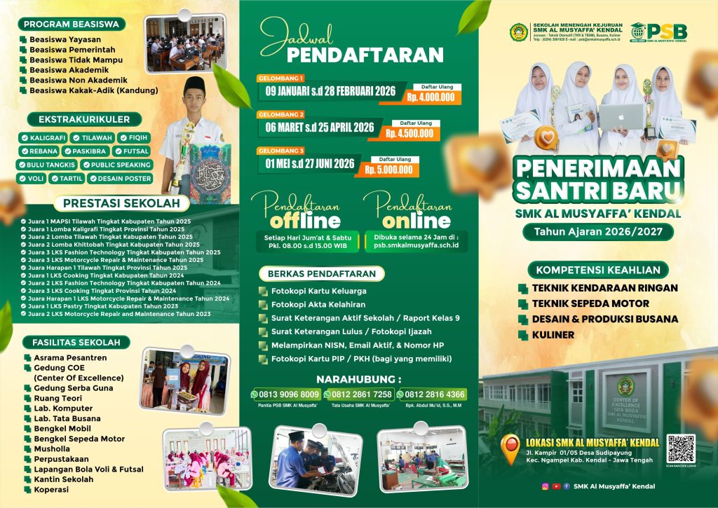 SMK Al Musyaffa’ Kendal kembali membuka Penerimaan Santri Baru (PSB) Tahun Ajaran 2026/2027. Pendaftaran dibuka untuk para peserta didik lulusan SMP/MTs sederajat yang ingin melanjutkan pendidikan di lingkungan sekolah berbasis pesantren dengan fasilitas lengkap dan kompetensi keahlian yang relevan dengan kebutuhan dunia kerja masa kini.