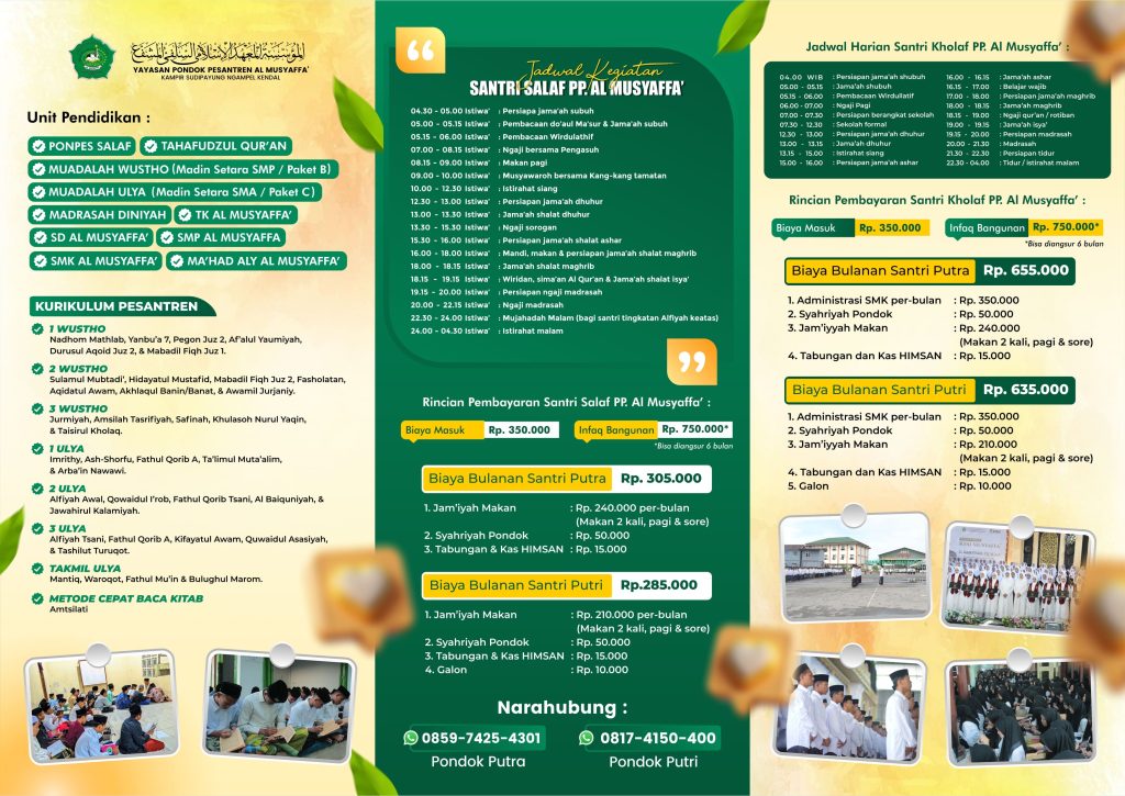 Dengan fasilitas lengkap, tenaga pendidik profesional, serta lingkungan yang religius dan mendukung pembentukan karakter, SMK Al Musyaffa’ Kendal siap menjadi pilihan terbaik untuk pendidikan anak-anak Anda.